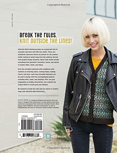 Détails: Description du produit Break the rules–knit outside the lines! AlterKnit Stitch Dictionary takes an unexpected look at stranded colorwork with 200 new motifs. These non-traditional colorwork charts are perfect for the creative knitter looking to break away from the ordinary. Derived from graphic design elements, these fresh motifs include everything from geometric mountains, waves, and spirals to modern bikes, skulls, and sheep. Dive into stranded colorwork with confidence with a section on reading charts, working floats, and choosing colors. Learn how stranded colorwork can be used in design with five accompanying projects including mitts, cowls, and sweaters. Plus, use your imagination to modify, deconstruct, and combine the unique motifs to create your own designs. Be inspired to break the rules and use charts in creative ways with AlterKnit Stitch Dictionary. Biographie de l’auteur Andrea Rangel is a knitwear designer and teacher. She’s the author of Rugged Knits (Interweave), and her patterns have been published in Interweave Knits, Knitscene, Brooklyn Tweed Wool People, Twist Collective, and other publications, as well as independently. She lives on Vancouver Island in British Columbia.