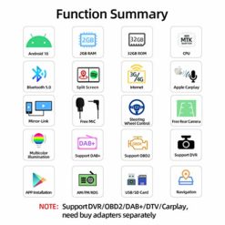 - 【ANDROID 10.0】Android 10.0, de nombreuses applications préinstallées Clé USB et disques durs jusqu’à 500 Go | Prise en charge du dongle 4G / 3G | Charger des smartphones via USB | Carte Micro SD jusqu’à 500 Go | Puissant processeur Octa-Core Cortex A7 x1,8 GHz | 2 Go de RAM / 32 Go de mémoire intégrée | WLAN | Bluetooth | MirrorLink (transfert d’écran du smartphone) avec iOS ou Android l Application compatible Torque OBD2 l Fonction RDS