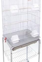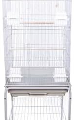 BAKAJI Cage volière pour Oiseaux, perroquets inséparables, calopsite, Cage perruches volatiles piédestal et Roues, Toit ouvrant et mangeoires, perchoirs en Bois, bac Amovible (Blanc)