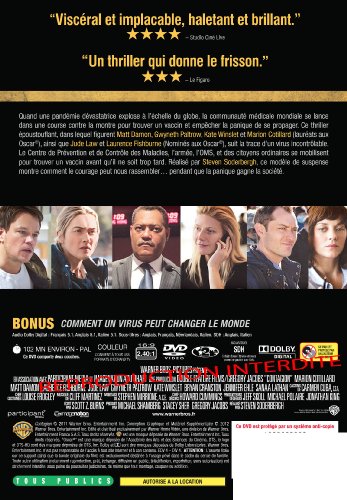 Détails: Description du produit Contagion, 1 DVD, 102 minutes Amazon.fr Une pandémie dévastatrice explose à l’échelle du globe… Au Centre de Prévention et de Contrôle des Maladies, des équipes se mobilisent pour tenter de décrypter le génome du mystérieux virus, qui ne cesse de muter. Le Sous-Directeur Cheever, confronté à un vent de panique collective, est obligé d’exposer la vie d’une jeune et courageuse doctoresse. Tandis que les grands groupes pharmaceutiques se livrent une bataille acharnée pour la mise au point d’un vaccin, le Dr. Leonora Orantes, de l’OMS, s’efforce de remonter aux sources du fléau. Les cas mortels se multiplient, jusqu’à mettre en péril les fondements de la société, et un blogueur militant suscite une panique aussi dangereuse que le virus en déclarant qu’on « cache la vérité » à la population… Synopsis Contagion suit la rapide progression d’un virus mortel, qui tue en quelques jours. Alors que l’épidémie se propage à grande vitesse, la communauté médicale mondiale tente, dans une course effrénée contre la montre, de trouver un remède et de contrôler la panique qui se répand encore plus vite que le virus. Les gens, eux, se battent pour survivre dans une société qui se désagrège…