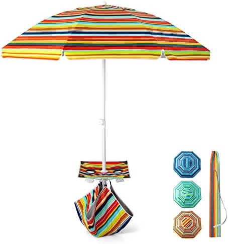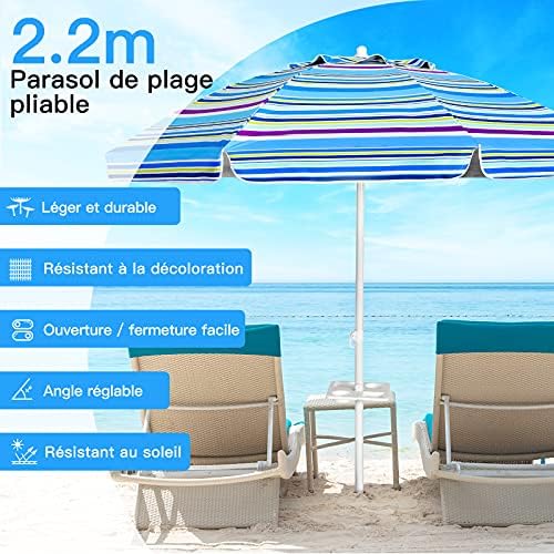 COSTWAY Parasol de Plage avec Porte-Gobelet, Parasol de Jardin Extérieur Inclinable, 200cm, Rond, Protection Solaire UPF50+, avec Pied d’ancrage à Visser & Sac de Transport (Bleu)