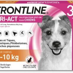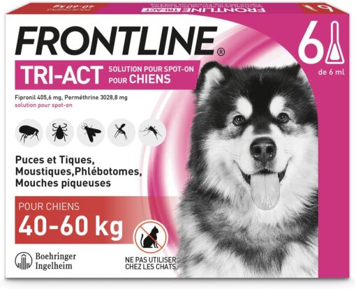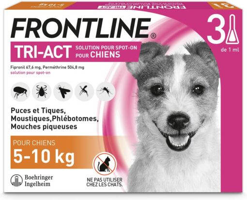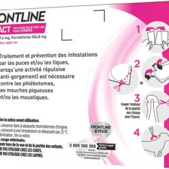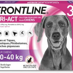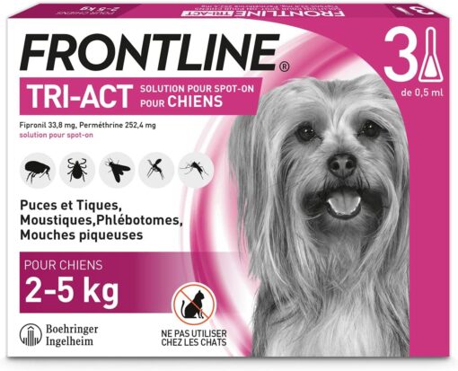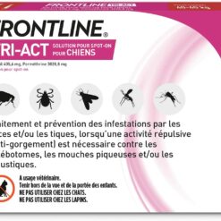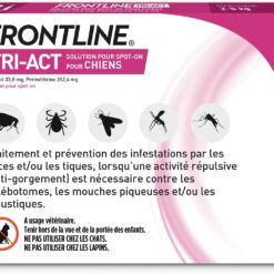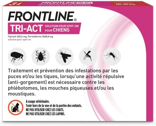 FRONTLINE TRI-ACT CHIEN, est un médicament vétérinaire. Lire attentivement la notice avant utilisation. Demandez conseil à votre pharmacien ou à votre vétérinaire. En cas de persistance des symptômes, consultez un vétérinaire. FRONTLINE TRI-ACT solution pour spot-on pour chiens 2 – 5 kg, FRONTLINE TRI-ACT solution pour spot-on pour chiens 5 – 10 kg, FRONTLINE TRI-ACT solution pour spot-on pour chiens 10 – 20 kg, FRONTLINE TRI-ACT solution pour spot-on pour chiens 20 – 40 kg, FRONTLINE TRI-ACT solution pour spot-on pour chiens 40 – 60 kg. INDICATIONS : À utiliser contre les infestations par les puces et/ou les tiques lorsqu’une activité répulsive (anti-gorgement) est nécessaire contre les phlébotomes, les mouches piqueuses et/ou les moustiques. Puces : Traitement et prévention des infestations par les puces Ctenocephalides felis et prévention des infestations par les puces Ctenocephalides canis. Un traitement prévient les nouvelles infestations par les puces pendant 4 semaines. Le médicament peut être intégré à une stratégie de traitement pour le contrôle de la dermatite par allergie aux piqûres de puces, quand celle-ci a été préalablement diagnostiquée par un vétérinaire. Tiques : Traitement et prévention des infestations par les tiques. Un traitement élimine les tiques (Dermacentor reticulatus, Ixodes ricinus, Rhipicephalus sanguineus), possède une activité répulsive contre les tiques (Ixodes Ricinus, Rhipicephaus sanguineus) pendant 4 semaines après traitement, et possède une activité répulsive contre Dermacentor reticulatus à partir de 7 jours et jusqu’à 4 semaines après le traitement. Moustiques et phlébotomes : Le médicament a une efficacité répulsive (anti-gorgement) pendant 3 semaines contre les phlébotomes (Phlebotomus perniciosus) et pendant 4 semaines contre les moustiques (Culex pipiens, Aedes albopictus). Le médicament a une efficacité insecticide rémanente pendant 3 semaines contre les phlébotomes (Phlebotomus perniciosus) et les moustiques (Aedes albopictus). Réduction du risque d’infection à Leishmania infantum transmis par les phlébotomes (Phlebotomus perniciosus) jusqu’à 4 semaines. L’effet est indirect de par l’action du produit sur le vecteur. Mouches d’étable : Le médicament possède une activité répulsive (anti-gorgement) et tue les mouches d’étable (Stomoxys calcitrans) pendant 5 semaines. CONTRE-INDICATIONS : Ne pas utiliser chez les animaux malades ou convalescents. Ce médicament est destiné uniquement aux chiens. Ne pas utiliser chez les chats et les lapins, car des effets secondaires parfois létaux peuvent survenir. Ne pas utiliser en cas d’hypersensibilité aux substances actives, ou à l’un des excipients. PRÉCAUTIONS À PRENDRE PAR LA PERSONNE QUI ADMINISTRE LE MÉDICAMENT : Le médicament peut causer une irritation de la peau et des yeux, par conséquent, éviter tout contact du médicament avec la peau ou les yeux. Ne pas ouvrir la pipette à proximité ou en direction du visage. En cas d’exposition oculaire ou d’irritation des yeux au cours de l’administration, rincer les yeux immédiatement et abondamment à l’eau. Si l’irritation oculaire persiste, demander un avis médical. En cas de contact cutané ou d’irritation de la peau au cours de l’administration, laver immédiatement et abondamment la peau avec de l’eau et du savon. Si l’irritation de la peau persiste ou réapparaît, demander un avis médical. Les personnes présentant une hypersensibilité connue au fipronil et/ou à la perméthrine doivent éviter tout contact avec le médicament. Le médicament est nocif en cas d’ingestion. Eviter tout contact entre les mains et la bouche. Ne pas fumer, boire ou manger pendant l’application. Se laver les mains après utilisation. En cas d’ingestion, rincer la bouche et demander un avis médical si vous ne vous sentez pas bien. Comme l’excipient N-méthylpyrrolidone peut induire une foetotoxicité et une tératogénicité après une exposition significative, les femmes enceintes doivent porter des gants afin d’éviter tout contact avec le médicament. Ne pas manipuler les animaux traités et ne pas autoriser les enfants à jouer avec les animaux traités jusqu’à ce que le site d’application soit sec. Il est donc recommandé que les animaux ne soient pas traités dans la journée mais plutôt en début de soirée, et que les animaux récemment traités ne soient pas autorisés à dormir avec les propriétaires, surtout les enfants. Garder les pipettes à conserver dans la plaquette thermoformée d’origine. Une fois utilisée, la pipette vide doit être immédiatement éliminée de façon appropriée, afin d’éviter un accès ultérieur. Mise à jour du texte : 10.08.2020 (Version 4.0)