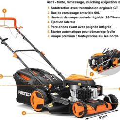 FUXTEC tondeuse thermique FX-RM5196 avec largeur de travail 51cm transmission GT autopropulsée puissante cylindrée 196cm3 Easy Clean 4en1 6CV / 4,4KW mulching/bac de ramssage 60L