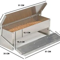 Descriptif de la mangeoire XL pour poules et volaillesNourrissez vos poules en toute tranquillité pendant vos absences avec ce distributeur automatique XL pouvant contenir jusqu’à 5 kg de nourriture.Les poules étant de grandes consommatrices de graines et légumineux, vous n’aurez plus à vous soucier de savoir si elles ont assez de quantité grâce à ce réservoir pour grains XL. Élément incontournable pour un élevage réussi, la mangeoire est équipée d’un couvercle qui s’ouvre lorsque la poule se positionne sur la plateforme prévue à cet effet. Un poids minimum de 500 gr est nécessaire pour actionner le levier. Une telle conception évite aux oiseaux, rats ou autres nuisibles de voler la nourriture de votre élevage. Ce fonctionnement intelligent joue sur le comportement alimentaire naturel de vos poules en leur permettant d’accéder à leur nourriture, uniquement lorsqu’elles ont faim.Avec sa capacité de réserve XL, la mangeoire offre de belles dimensions. Profitez d’un bac pouvant accueillir jusqu’à 5 kg de nourriture et mesurant 51 cm de longueur x 21 cm de largeur x 8.5 cm de hauteur. Vous pourrez nourrir plusieurs poules et cela pendant quelques jours selon la taille de votre élevage. Pratique et résistante, ce distributeur automatique innovant permet de conserver de manière optimale la nourriture de vos poules et évite le gaspillage grâce à ses parois fermées. Dimensions de la mangeoire XL pour poules et volailles- Dimensions totales : Longueur 51 cm x largeur 35 cm x Hauteur 18.5 cm- Dimensions couvercle : Longueur 51 cm x largeur 21 cm- Profondeur du bac : 8.5 cm- Dimensions de la plateforme à levier : Longueur 51 cm x largeur 13 cm- Hauteur du levier : 7 cm- Poids nécessaire sur la plateforme pour ouvrir le couvercle : 500 gr- Capacité de réserve totale : 5 kg- Matériaux : acier galvanisé