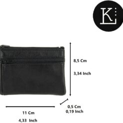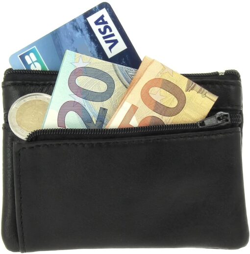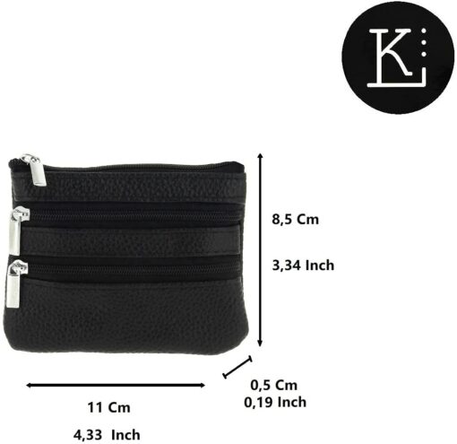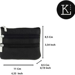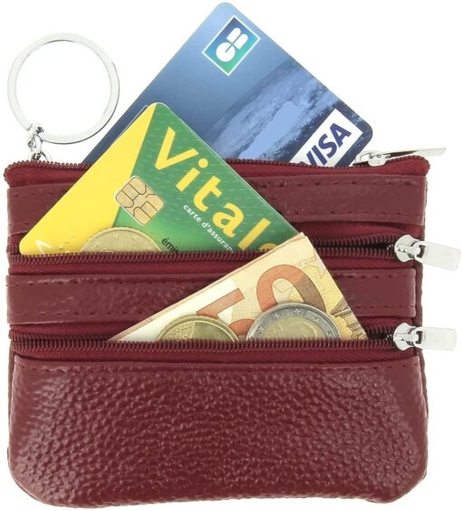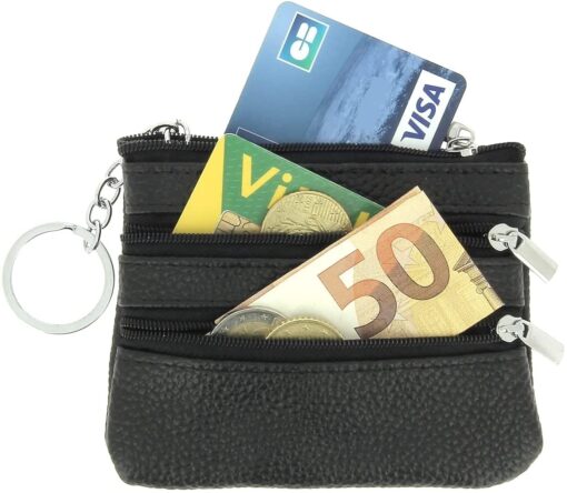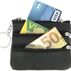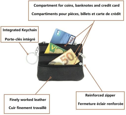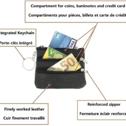 - Il est tout en un avec ses 3 compartiments à fermeture éclair. Vous pouvez y ranger votre monnaie d’un côté et vos billets de l’autre et votre carte bancaire, vous trouverez également dans l’un des compartiments, un porte-clefs intégré.
