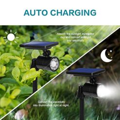 - [Spots Solaire Facile à Installer]: Aucun câblage à demander. Éclairage àl’utilisation polyvalent, super compact design, peut être inséré dans le sol ou fixé sur le mur. Le support de la lampe et le panneau solaire peuvent être tourné librement pour mieux capter la lumière solaire, ou pour éclairer aux différentes direction.
