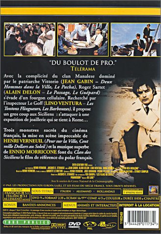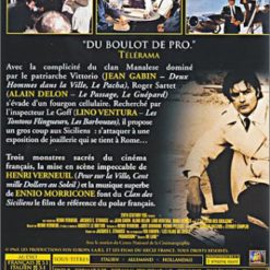 Détails: Rien que l’affiche a de quoi vous mettre K.O. ! Gabin, Delon et Ventura réunis dans le film sous la direction de Henri Verneuil et sur un scénario de José Giovanni, d’ailleurs adapté d’Auguste Le Breton. De la qualité française de rêve comme on ne risque guère d’en revoir dans l’Hexagone. Dans Le Clan des Siciliens, Delon, lumineux, campe Roger Sartet, braqueur multirécidiviste sur le point d’être condamné à mort, qui parvient à s’échapper de manière spectaculaire, grâce au soutien logistique d’une famille mafieuse, le Manalese. L’implacable inspecteur Le Goff (Ventura) à ses trousses, Sartet n’hésite pourtant pas à se lancer, avec Vittorio Manalese (Gabin), dans un ultime et périlleux braquage : le détournement, en plein vol, d’un avion de ligne transportant plusieurs millions en diamants ! Si les effets spéciaux ont pris un petit coup de vieux, le film entier est une pure merveille d’intrigue et d’efficacité : l’enquête de l’expéditif Le Goff fonctionne toujours à plein, les dialogues sont à couper au couteau (voir la scène de drague autour d’une anguille morte entre Delon et la brûlante Irina Demick), et la composition d’Ennio Morricone pour le film reste l’une des plus mémorables et réussies du maître de musique cinématographique italien. Carré, efficace, solide : assurément, du travail excessivement bien fait, qui permet au Clan des Siciliens de rester l’un des meilleurs polars français plus de trente ans après sa sortie. –Jean-Pascal Grosso