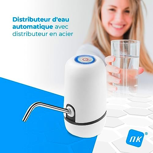 NK Distributeur d’eau en Bouteille Automatique – Chargeur USB, en Acier, sans BPA, Eau Froide, 1200mAh, Carafes et Bouteilles 1.5L, 5.7L, 10L, 11.3L, 15L, 18.9L, Blanche (2 Adaptateurs 3.8 & 4.8cm)