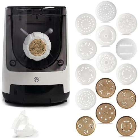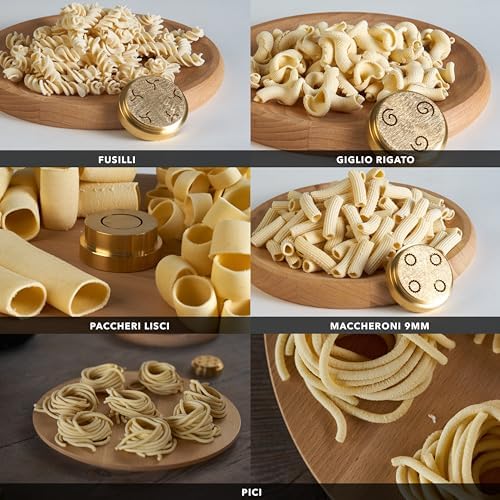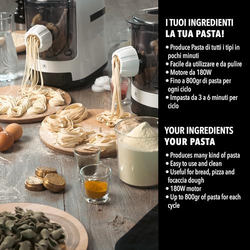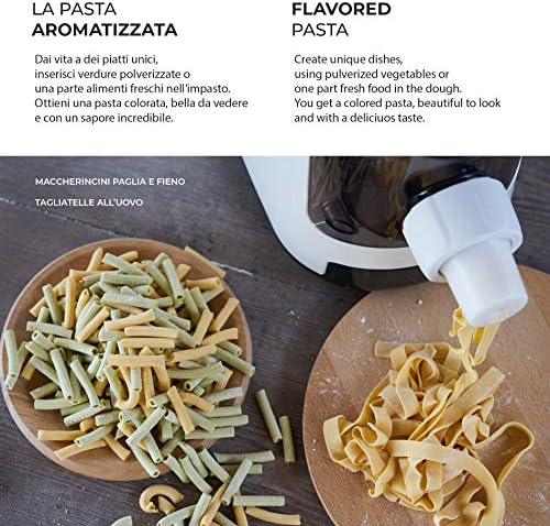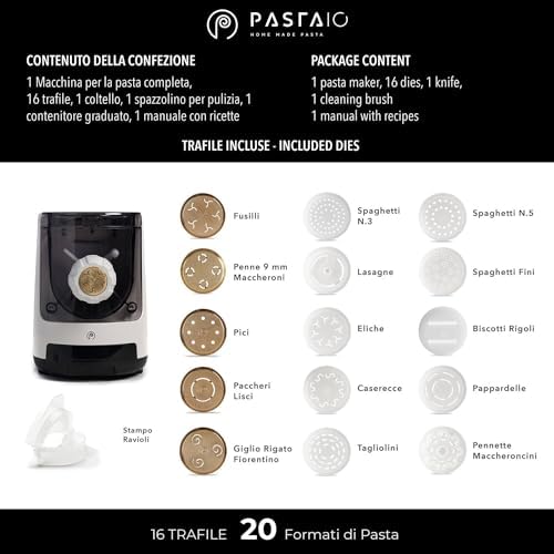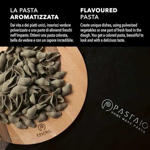 PASTAIO Machine à pâtes avec 16 Matrices dont 5 en bronze. Pasta Maker, balance intégrée, extrusion rapide, jusqu’à 800g de pâtes, jusqu’à 25 types de pâtes différentes. Classe Italie