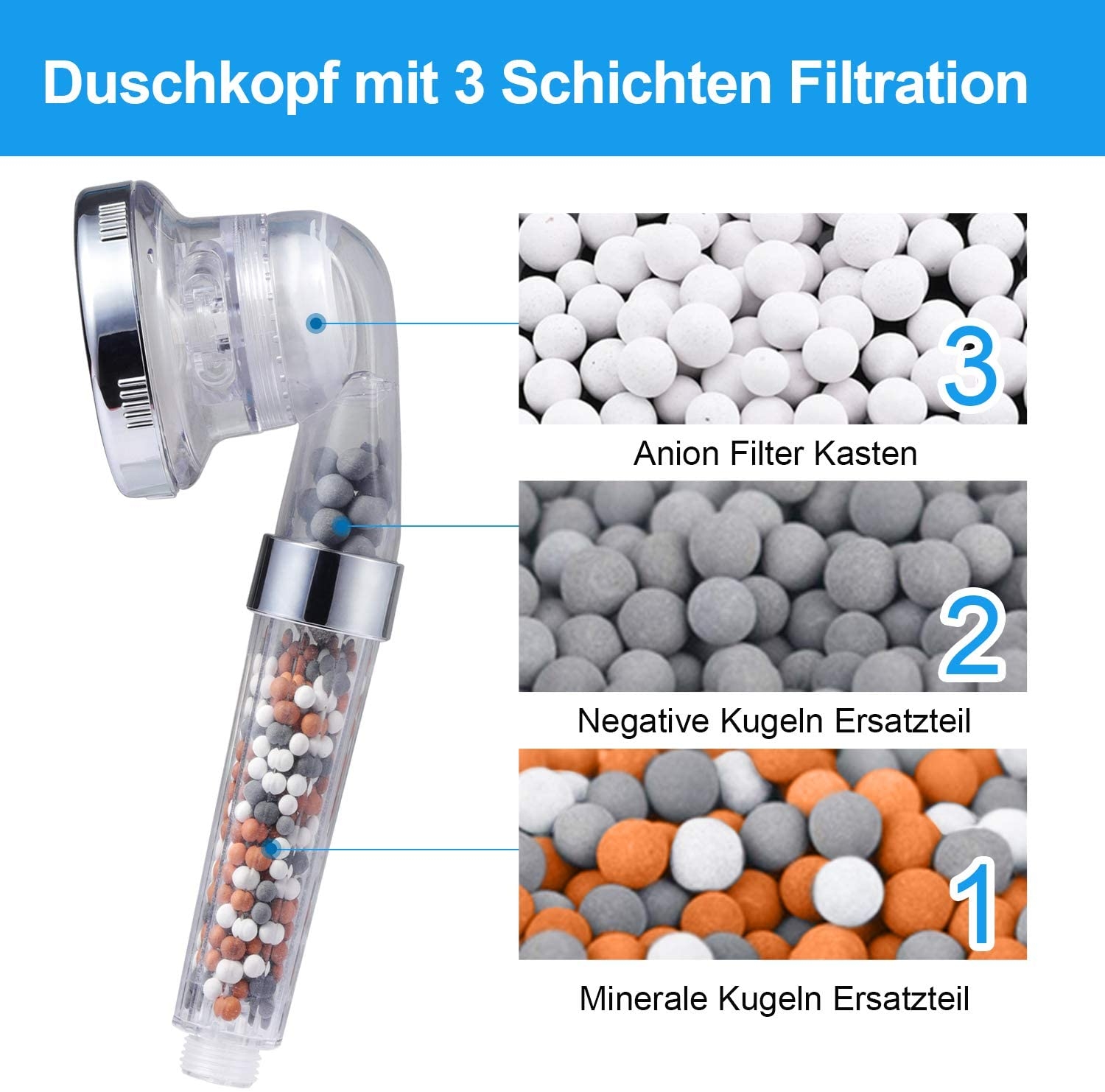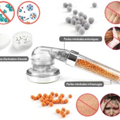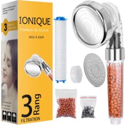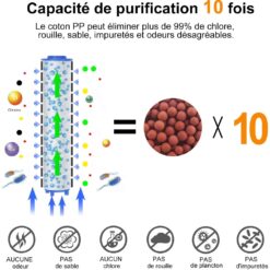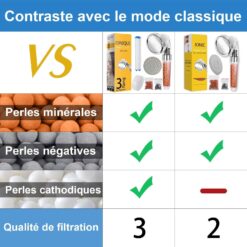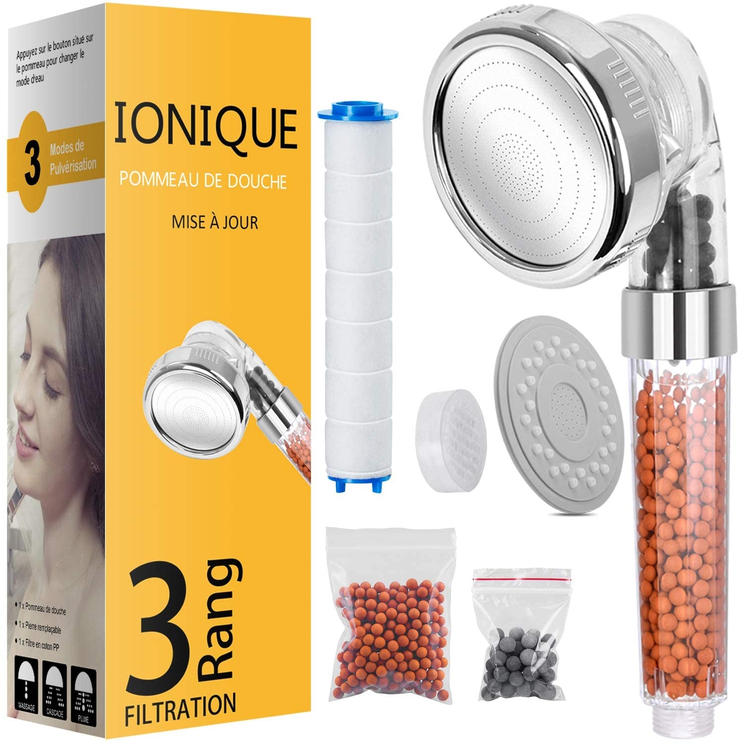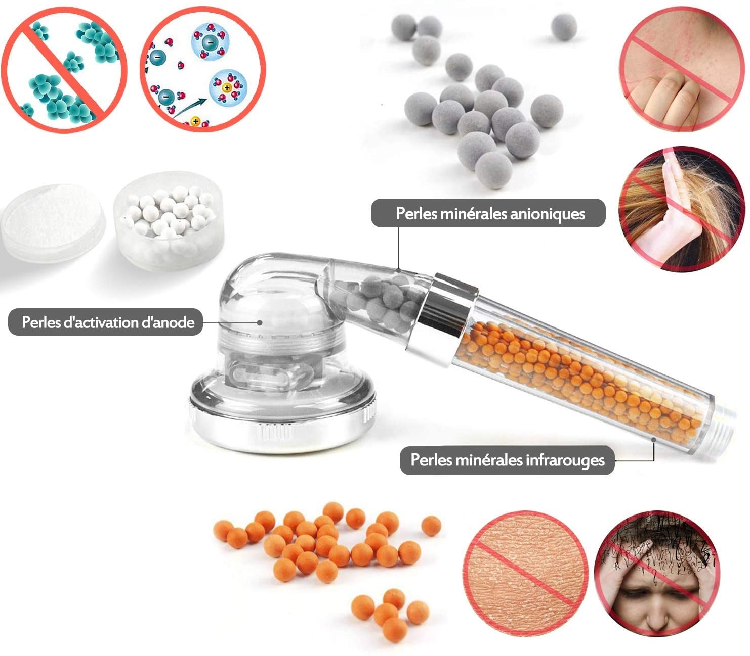 - 🚿【Filtration à 3 niveaux mise à jour】Notre pommeau de douche inclut une couche de filtration de plus que tous les autres produits en vente actuellement ; ainsi, il adoucit l’eau dure (haute concentration d’ions calcium et magnésium), et participe à éliminer chlore et fluorure, métaux lourds, toxines, bactéries, ainsi que la rouille et les mauvaises odeurs dues aux dépôts de matériaux dans l’arrivée d’eau. Notre but est de vous offrir une douche des plus pures et saines à la maison.