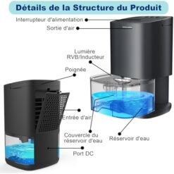 Powate Déshumidificateur 1000 ML,Déshumidificateur d’Air Electrique Silencieux Portable Compact Arrêt Automatique,Silencieux,Résistance à La Moisissure,Lumière7 LED Couleur,Chambre,Bain, Armoire,Noir