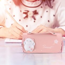 qiwuhai Trousse à Trois Compartiments pour Filles, Grande Trousse à Crayons, Trousse de Rangement Portable avec Mignons Chatons, Cadeau d’école pour Filles, Femmes et Adolescentes (Rose)