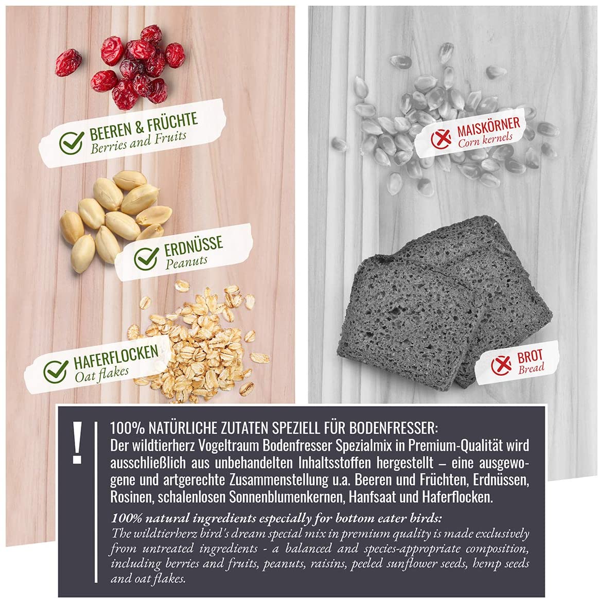 Flocons d’avoine, blé / grains concassés / farine de blé, graines de tournesol sans coquille, flocons de blé, millet blanc, arachides blanchies, milokorn (sorgho), mélange de baies / fruits, huile végétale, raisins secs / raisins secs, graines de chanvre