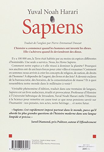Détails: Description du produit Il y a 100 000 ans, la Terre était habitée par au moins six espèces différentes d’hominidés. Une seule a survécu. Nous, les Homo Sapiens. Comment notre espèce a-t-elle réussi à dominer la planète ? Pourquoi nos ancêtres ont-ils uni leurs forces pour créer villes et royaumes ? Comment en sommes-nous arrivés à créer les concepts de religion, de nation, de droits de l’homme ? À dépendre de l’argent, des livres et des lois ? À devenir esclaves de la bureaucratie, des horaires, de la consommation de masse ? Et à quoi ressemblera notre monde dans le millénaire à venir ? Véritable phénomène d’édition, traduit dans une trentaine de langues, Sapiens est un livre audacieux, érudit et provocateur. Professeur d’Histoire à l’Université hébraïque de Jérusalem, Yuval Noah Harari mêle l’Histoire à la Science pour remettre en cause tout ce que nous pensions savoir sur l’humanité : nos pensées, nos actes, notre héritage… et notre futur. Revue de presse Recommandé par Mark Zuckerberg le dernier essai de Yuval Noah Harari est un best-seller mondial . De l’ âge de la pierre à la Silicon Valley, au carrefour des sciences et de la philosophie, » Sapiens » interroge l ‘ histoire globale de l ‘ humanité à un rythme haletant. –L’obs Voici un pavé de cinq cents pages sorti en septembre, mais qui aurait fait un excellent polar de l été. […] Un brillant travail de vulgarisation et une nécessaire mise en garde sur le devenir de l humanité. –Le Monde des Religions Biographie de l’auteur Yuval Noah Harari est docteur en Histoire, diplômé de l’Université d’Oxford. Aujourd’hui, il enseigne dans le département d’Histoire de l’université hébraïque de Jérusalem et a remporté le « prix Polonsky pour la Créativité et l’Originalité » en 2009 et en 2012.Ses ouvrages Sapiens et Homo Deus sont devenus des phénomènes internationaux : traduits dans près de 40 langues et présents sur toutes les listes de bestsellers à travers le monde.