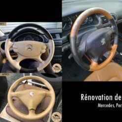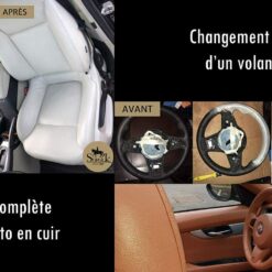 Dans la voiture : volant, sièges, panneaux latéraux, tableaux de bord en cuir, pare-soleil en cuir, levier de vitesses, frein à main, etc.