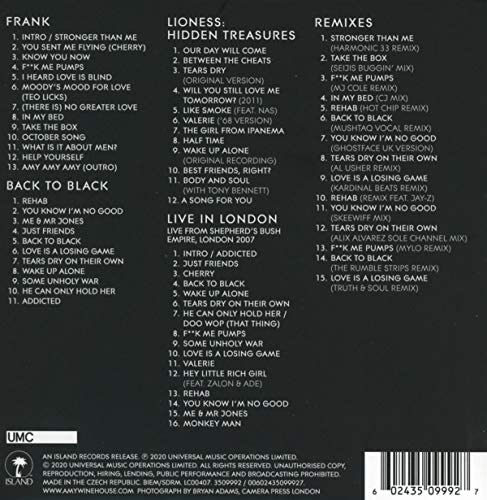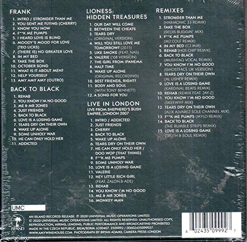 Amy Winehouse nous a quitté il y a dix ans, le 23 juillet 2011. Depuis sa tragique disparition, l’étoile d’Amy Winehouse ne cesse d’étinceler : d’Adele à Lana Del Rey et nombreux sont ceux, qui clament aujourd’hui son héritage artistique. Retrouvez la Diva de la Soul à travers l’intégralité de ses albums en réédition.Avec les albums Frank en 2004 et Back to Black en 2006, le talent brut et les harmonies vocales miraculeuses d’Amy Winehouse, ont ressuscité les grandes voix du passé et conquis dans un même élan les charts du monde entier. Amy reste unique, car ses chansons contiennent l’ingrédient qui relie les légendes de la musique et l’auteur-interprète des standards contemporains ‘Rehab’, ‘Back to Black’ et ‘Love is a Losing Game’ : une âme.