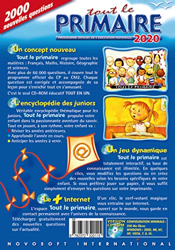 Détails: TOUT LE PRIMAIRE 2020 regroupe sur un seul CD-ROM toutes les matières : Français, Mathématiques, Histoire, Géographie et Sciences. Avec plus de 66000 questions dont 2000 nouvelles, il couvre tout le programme officiel du CP au CM2. Véritable encyclopédie thématique pour les juniors, TOUT LE PRIMAIRE 2020 propulse votre enfant dans la passionnante aventure du savoir. Tout en jouant à son rythme, votre enfant va pouvoir choisir : Réviser les années antérieures – Approfondir l’année en cours – Anticiper les années à venir. TOUT LE PRIMAIRE 2020 est utilisé quotidiennement par les professeurs de près de 1000 écoles primaires (liste sur le site de l’éditeur : www.novosoft-online.com).