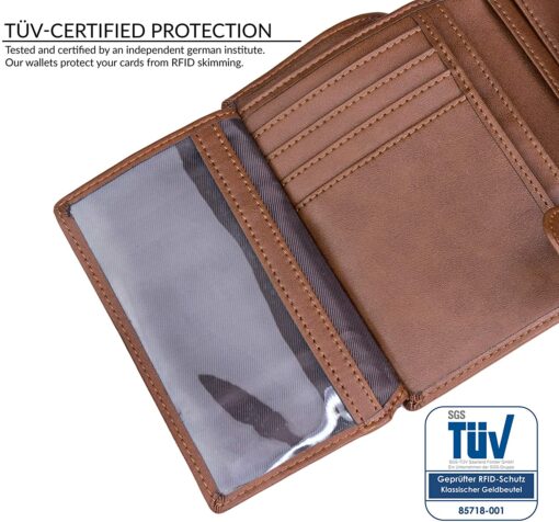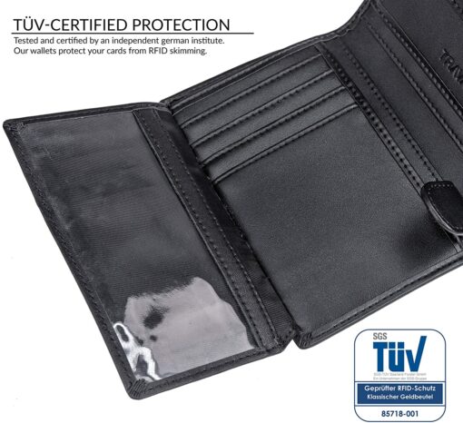 Sécurité certifiée TÜVNos portefeuilles ont été vérifiés par un institut indépendant allemand. Ils bloquent la fréquence standard 13,56 Mhz et protègent du vol de données par lecteurs RFID et NFC |