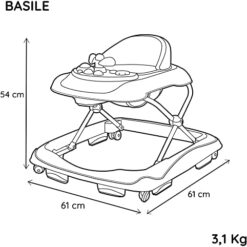 Trotteur BASILE avec pliage facile – A partir de 6 mois jusqu’à 12 Kg max – Plateau d’éveil sonore – Réglable en 3 hauteurs (Gris)
