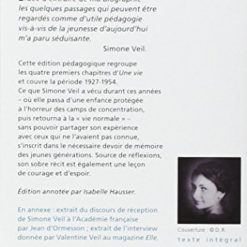 Détails: Description du produit L’idée d’extraire de ma biographie les quelques passages qui peuvent être regardés comme d’utile pédagogie vis-à-vis de la jeunesse d’aujourd’hui m’a paru séduisante. Simone Veil. Cette édition pédagogique regroupe les quatre premiers chapitres d’Une vie et couvre la période 1927-1954. Ce que Simone Veil a vécu durant ces années – où elle passa d’une enfance protégée à l’horreur des camps de concentration, puis retourna à la « vie normale » – sans pouvoir partager son expérience avec ceux qui ne l’avaient pas connue, s’inscrit dans le nécessaire devoir de mémoire des jeunes générations. Source de réflexions, son sobre récit est également une leçon de courage et d’espoir. Édition annotée par Isabelle Hausser. En annexe : extrait du discours de réception de Simone Veil à l’Académie française par Jean d’Ormesson ; extrait de l’interview donnée par Valentine Veil au magazine Elle. Biographie de l’auteur Simone Veil est née en 1927 à Nice. Agée de 17 ans, elle est déportée à Auschwitz. Des études à l’Institut d’Etudes Politiques et à la Faculté de droit la conduisent à entamer une carrière de magistrate. En 1974, elle entre au gouvernement comme Ministre de la Santé et fait voter la loi de légalisation de l’avortement. Elle devient en 1979 la première femme présidente du Parlement Européen. Elle poursuit depuis une carrière politique hors du commun. Elle a été membre du Conseil constitutionnel de 1998 à 2007. Elle a été reçue à l’Académie française en avril 2010.