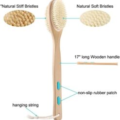 Brosse pour le corps humide ou sec avec manche long en bois avec poils doux et rigides pour exfoliation, détox et cellululite, circulation sanguine, bonne santé et beauté.