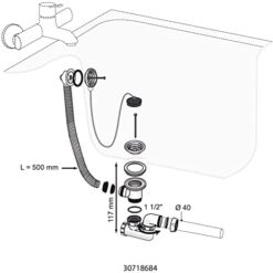 Wirquin SP5502 Vidage de baingoire L500 siphon orientable D40, bonde à bouchon, blanc