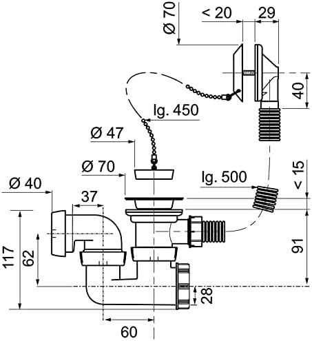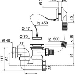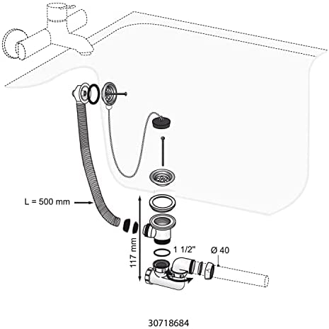 quantité de Wirquin SP5502 Vidage de baingoire L500 siphon orientable D40, bonde à bouchon, blanc