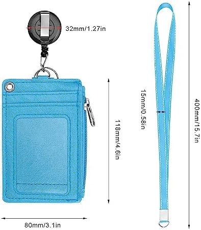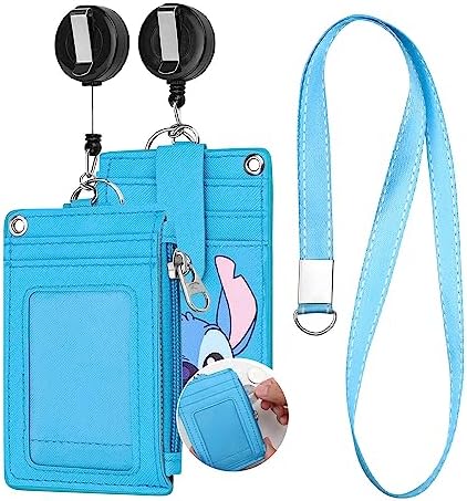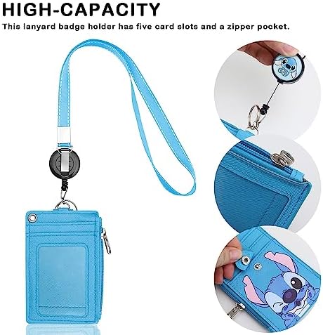 WJUAN PU Titulaire de La Carte de Lanière, 5 Emplacements Pour Cartes et 1 Poche Zippée, Longueur Totale 57 cm, Porte Badge Avec Boucle Rétractable, Style Cartoon Mignon Bleu