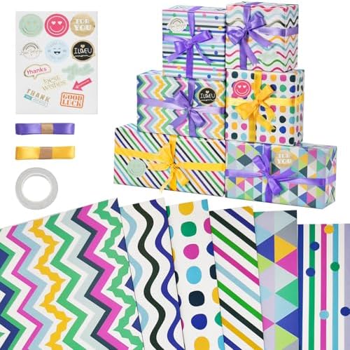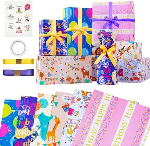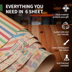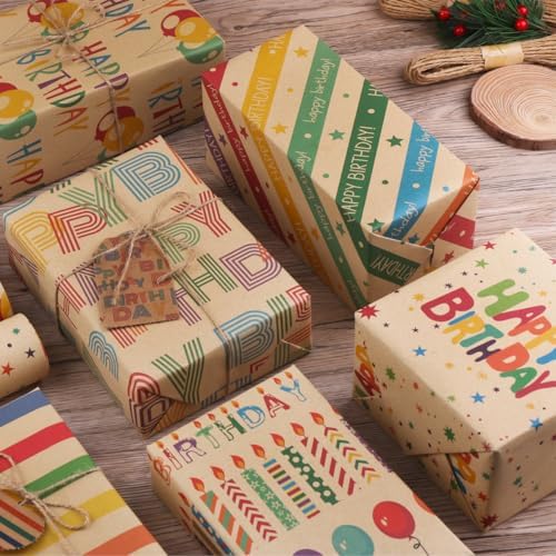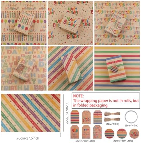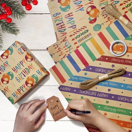 Zindoo Papier Cadeau Papier Anniversaire d’emballage avec Étiqueter et Ficelle Papier Cadeau Kraft Recyclable Papier Emballage Cadeau pour Enfant Bébé Fille Garcon Femme Homme